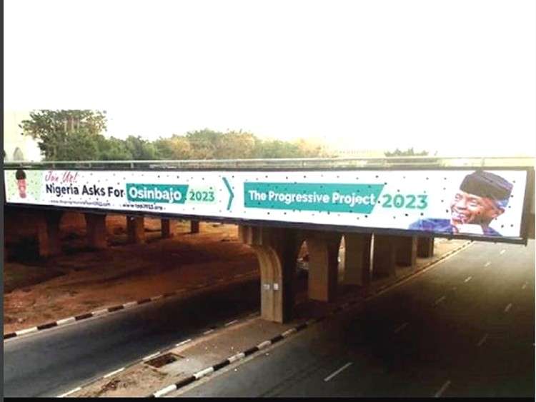 The Presidential campaign banner which was hung on bridges in strategic location in Abuja had the picture of the Vice President, with the inscription:“Join us, Nigeria asks for Osinbajo 2023.”