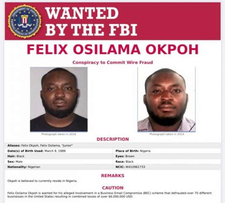 He said Okpoh, alongside Richard Izuchukwu Uzuh, Alex Afolabi Ogunshakin, Abiola Ayorinde Kayode and Nnamdi Orson Benson, were declared wanted by the FBI in 2019 for their alleged involvement in a scam in which over 70 businesses in the United States were defrauded of over $6million.