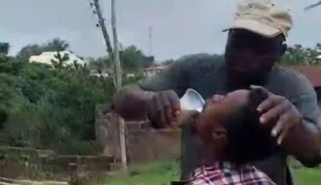 In a viral video which shocked not a few people; he made the young man kneel down and forced him to drink poison.