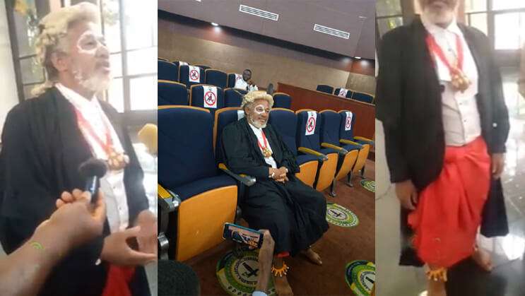 A Lagos based Lawyer, Malcolm Omoirhobo appeared in Court proceedings at the Supreme Court, in a full traditional regalia. Bare-footed, and with his left eye painted with native chalk around it, he wore “Olokun”, the regalia of the Goddess of the river, in Court. He tied a red wrapper, and had two feathers on his professional head rest.