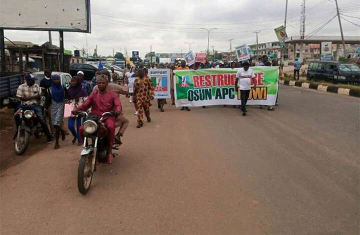 A faction of the All Progressives Congress (APC), loyal to the Minister of Interior, Rauf Aregbesola, on Tuesday, embarked on a protest, against the leadership of the Party in the State and to celebrate the defeat of Governor Gboyega Oyetola in July election.