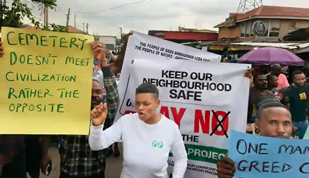 The protesters carrying placards with inscriptions such as “No Cemetery Here”, “Our Health Matters”, and “Protect Our Children, Stop the Cemetery Project”, the demonstrators accused the developers of attempting to force the project on them without community consent.