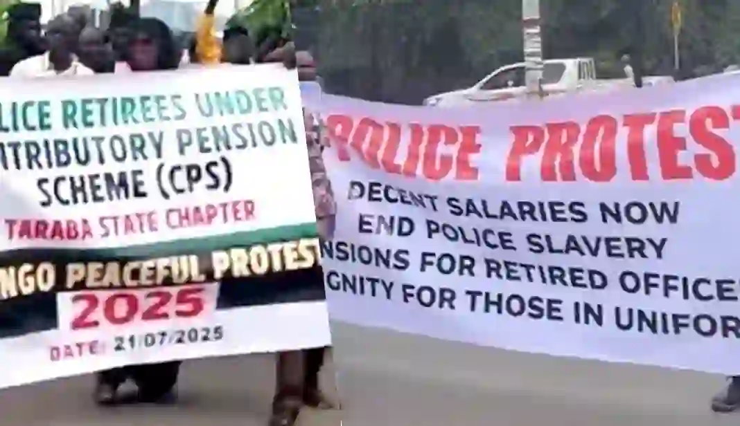 The inscriptions on some of the placards read, ‘We demand total exit from the deadly Police Contributory Pension Scheme,’ Scrap police contribution pension scheme,’ and ‘We need our full gratuity’.