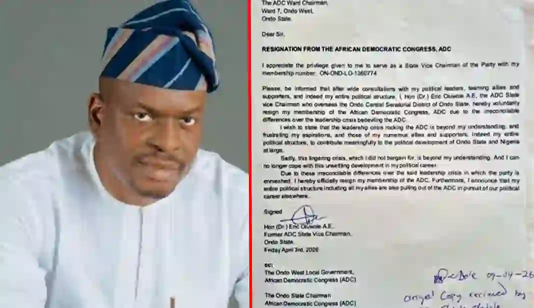 Dr. Eric Oluwole, Vice Chairman of the African Democratic Party (ADC) in Ondo State, has resigned from the party. In resigning, he cited unresolved internal disputes.